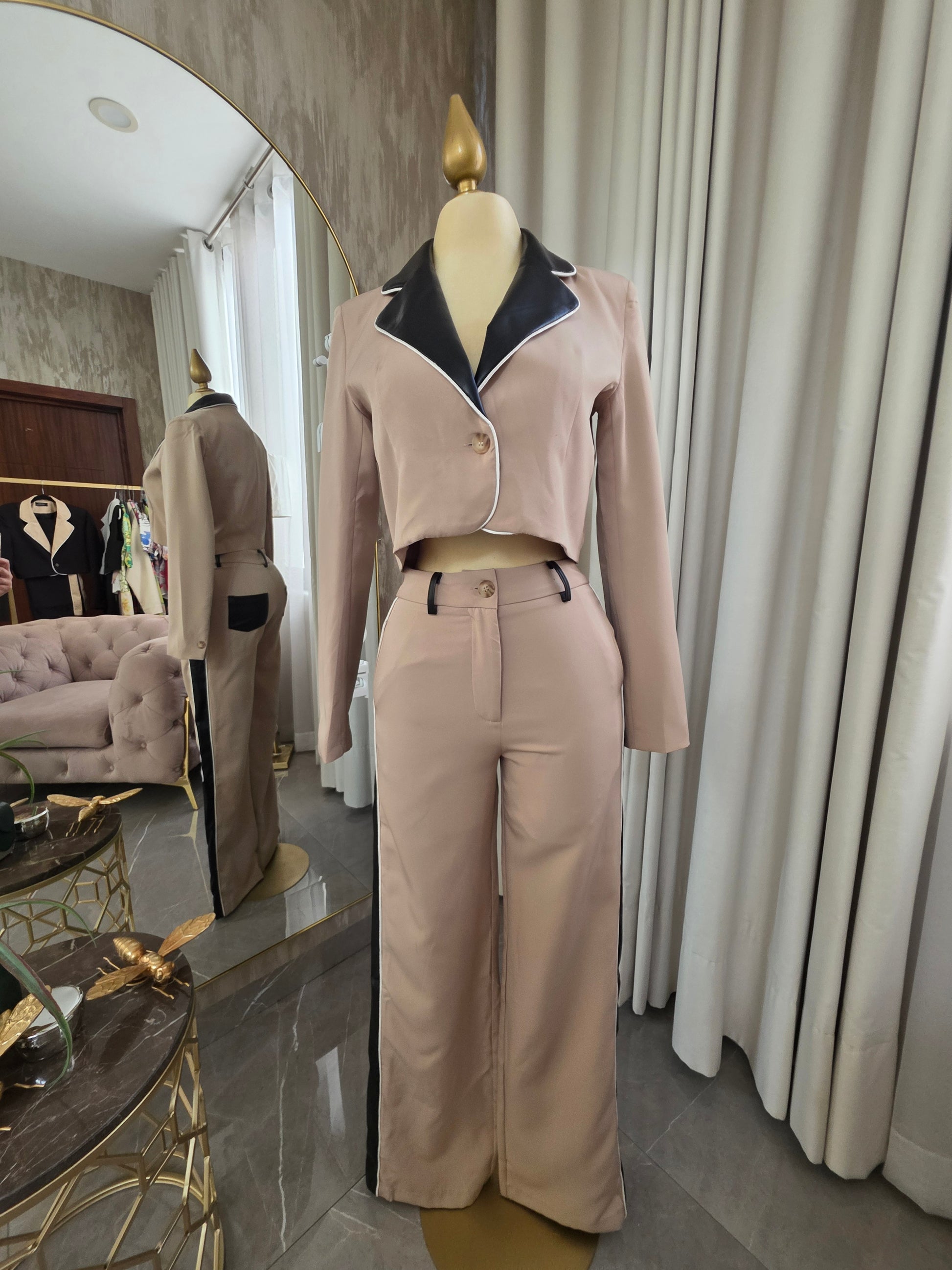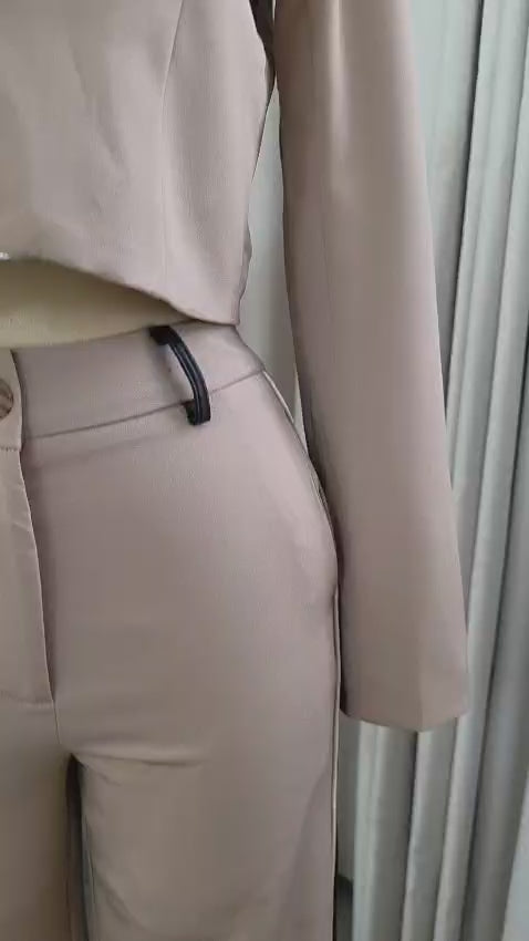 Este conjunto beige manga larga saco corto es impactante y hermoso. La tela strech permite que se ajuste cómodamente al cuerpo, realzando tu figura. Ideal para lucir sofisticada y a la moda en cualquier ocasión. ¡No te lo pierdas!